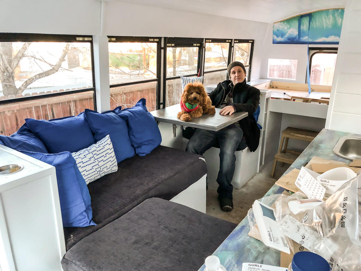 Bus Conversion: How we fit a living room, dining room, office, guest bed and storage in 20 square feet.